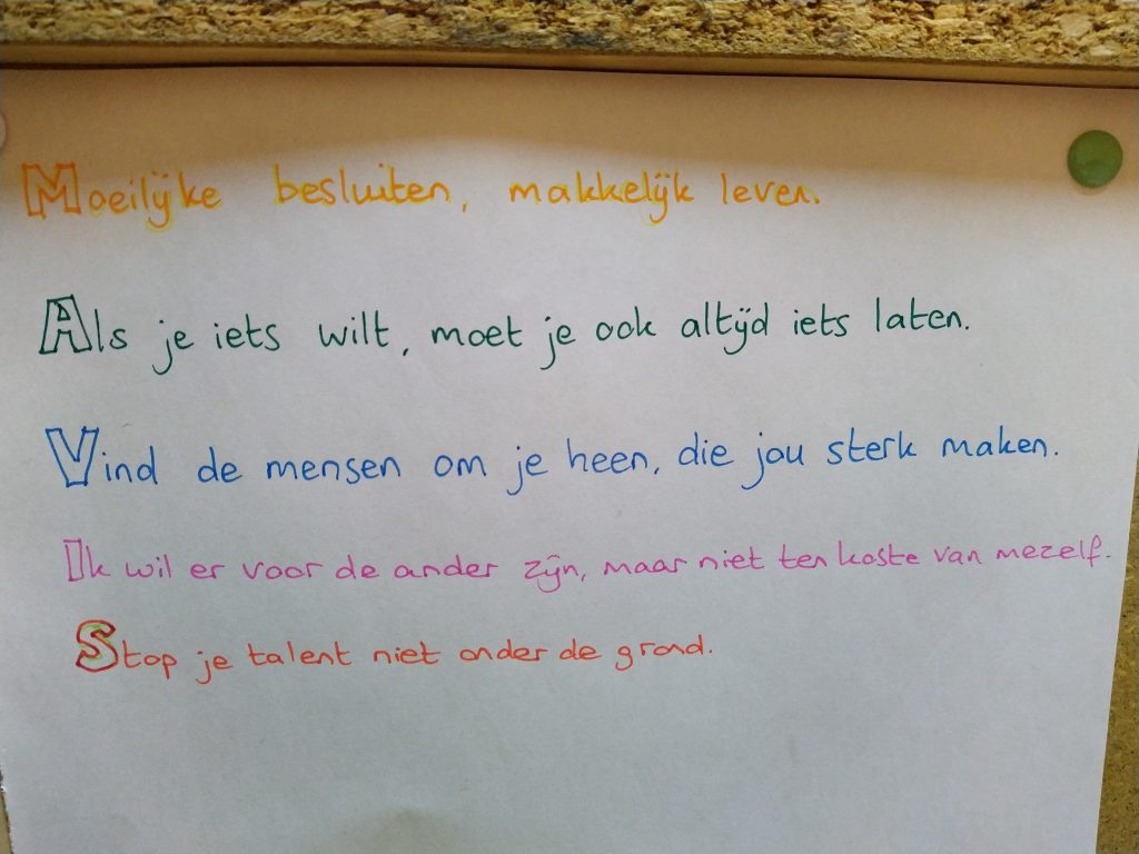 Nee, de keuzes waren lang niet altijd gemakkelijk. Sommige waardevolle contacten bewust even on hold zetten, tijd inruimen voor mezelf, alles inplannen in mijn agenda om bewustzijn te creëren van wat hoeveel tijd vraagt. Lastig voor iemand die op de mensen om zich heen gericht is.
